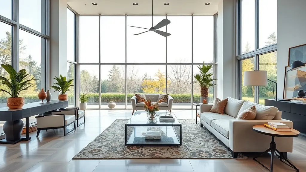 Bright living room with large windows and cozy decor.